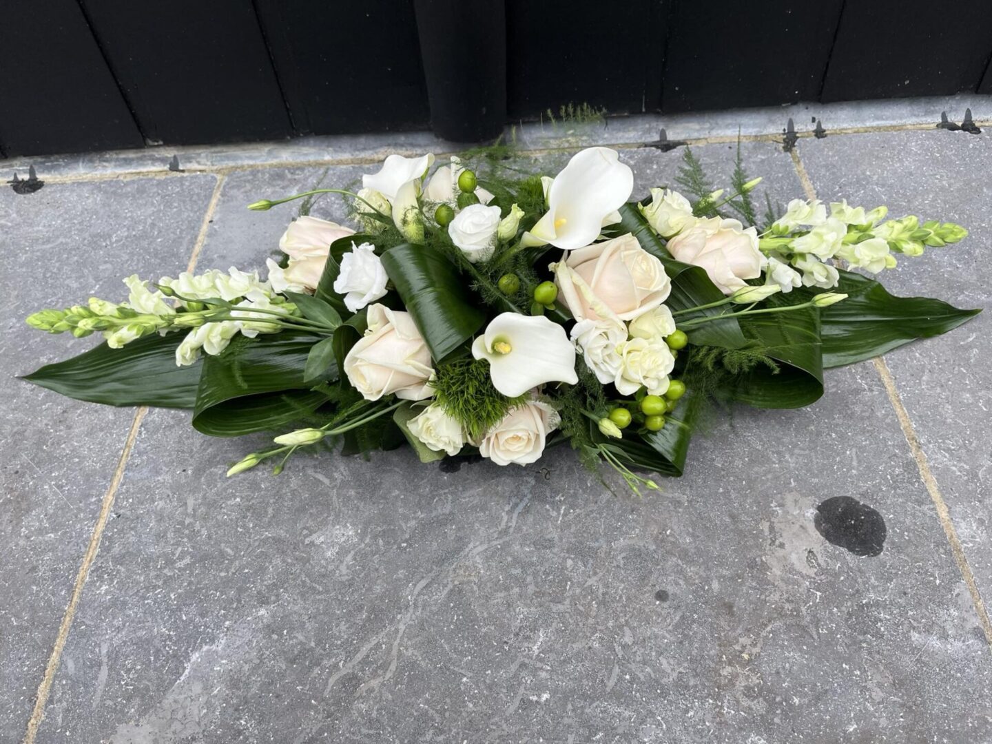 Ovaal met rozen, calla en leeuwebek